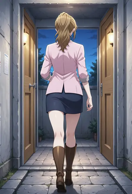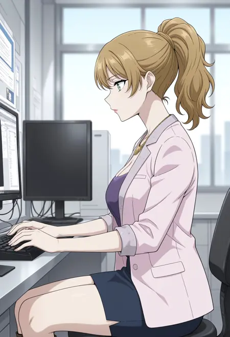 ma1n_br0wn_ga1, 1girl, solo, brown hair, ponytail, green eyes, lips, lipstick, collarbone, cleavage, medium breasts, jewelry, gold necklace, pink jacket, open jacket, blazer, sleeves rolled up, purple shirt, blue skirt, pencil skirt, brown footwear, knee boots