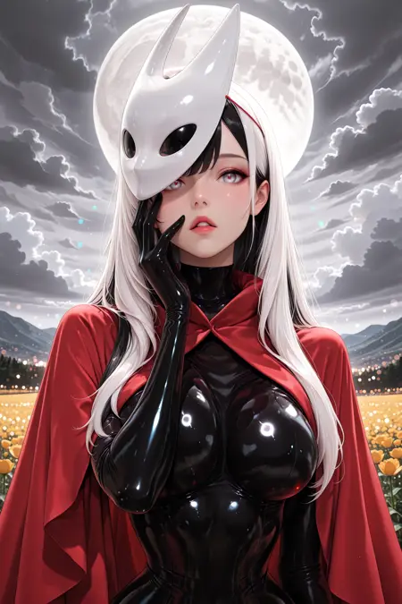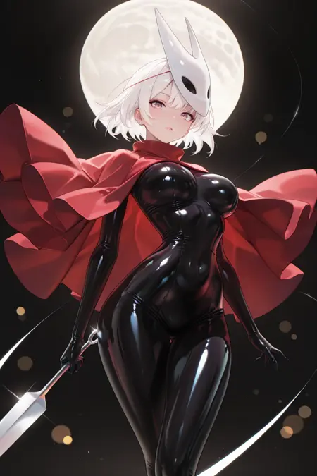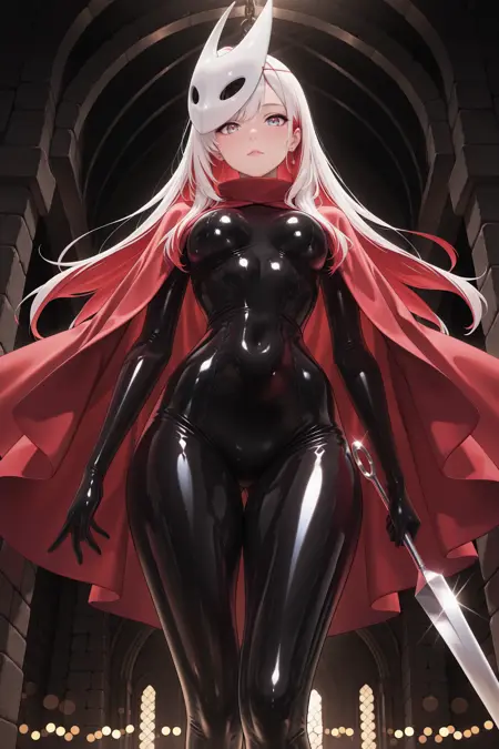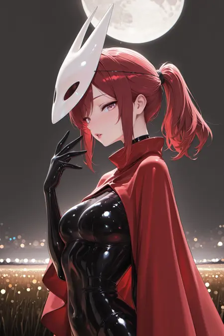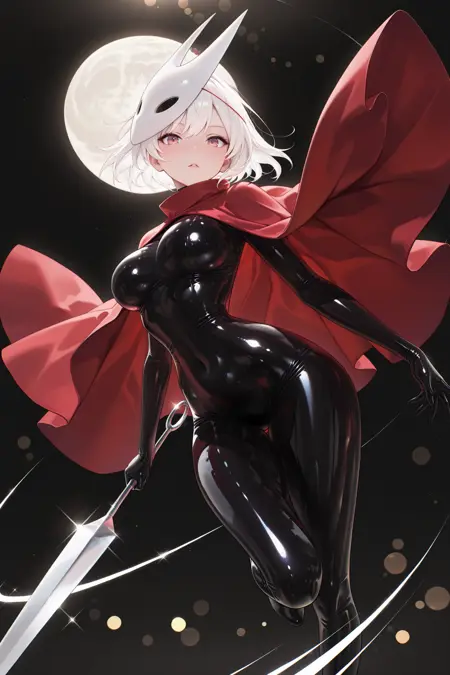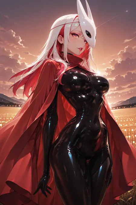hornet cosplay, white mask, mask on head, skin tight, black bodysuit, latex bodysuit, red cape,