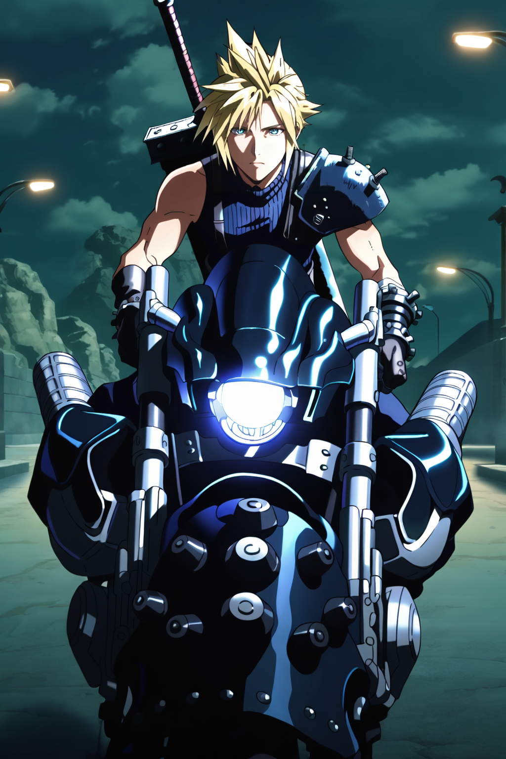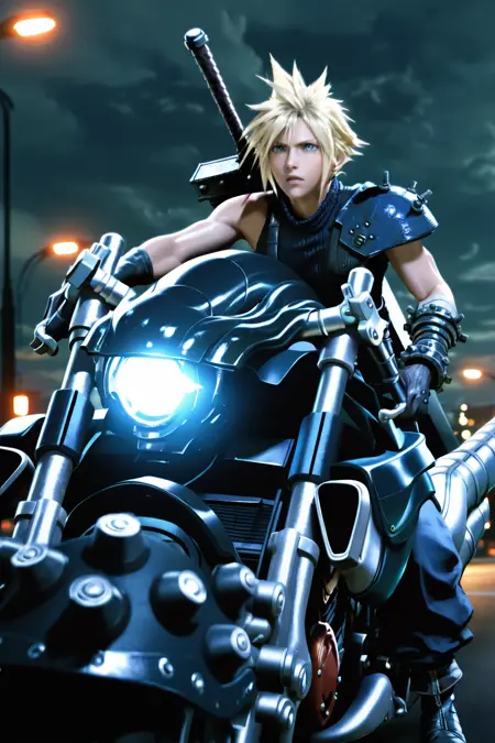 | 학습된 단어 | CloudStrife, solo, looking at viewer, blue eyes, blonde hair, 1boy, standing, full body, male focus, sleeveless, pants, belt, suspenders, spiked hair, shoulder armor, sleeveless turtleneck, huge weapon, baggy pants, buster sword, weapon on back,복사됨! |