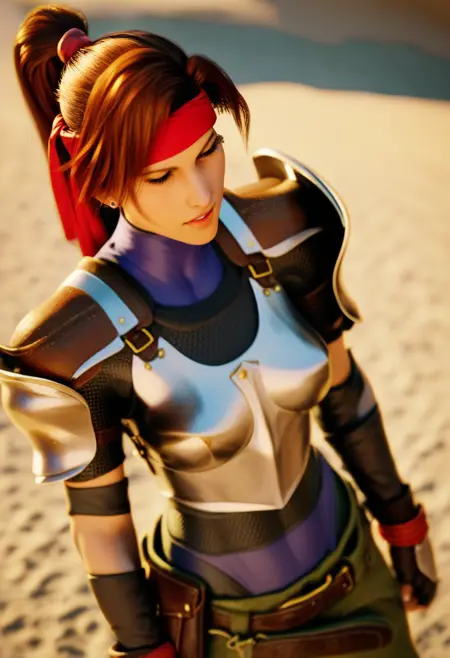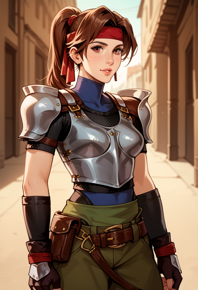 触发词:jessieff,棕色头发女性,马尾辫,红色发带,露指手套,盔甲,胸甲,肩甲,腰带