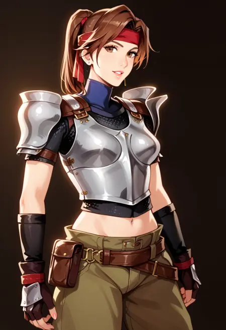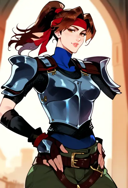 jessieff, brown hair female, ponytail, red headband, fingerless gloves, armor, breastplate, shoulder armor, belt