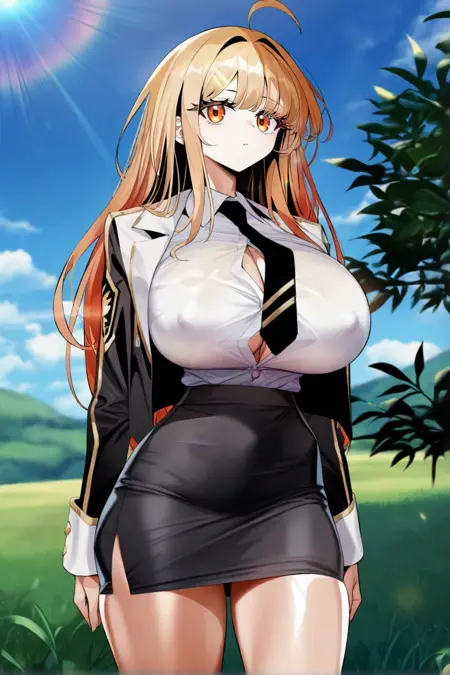 san su-yu, 금발, 오렌지색 머리, 긴 머리, 앞머리, 아호게, 거대한 가슴,