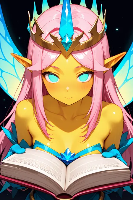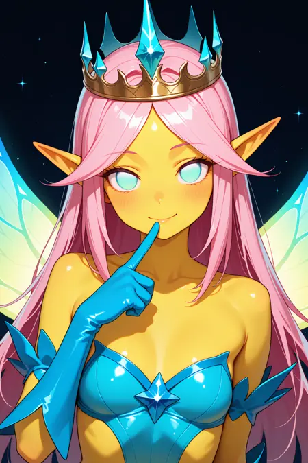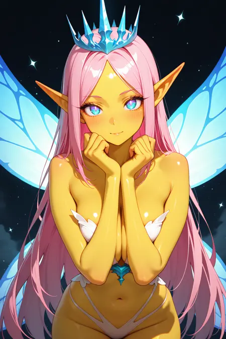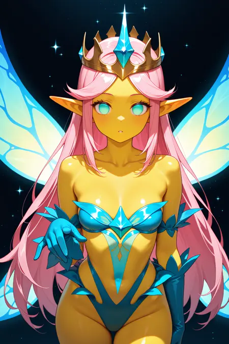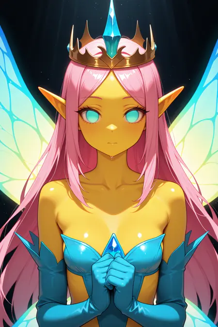1girl, solo, empress of light, fairy wings, crown, yellow skin, no pupils, long hair, pink hair, bare shoulders,