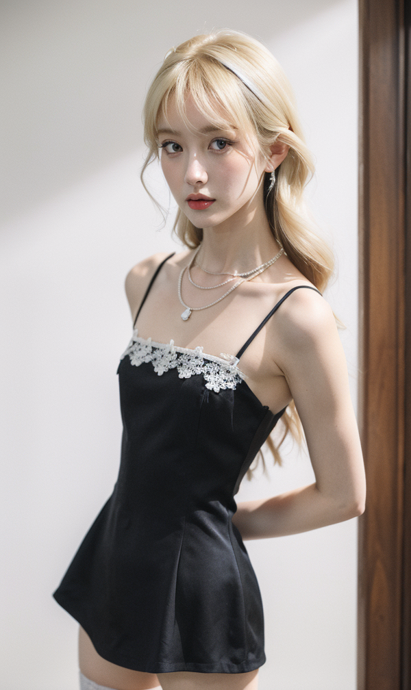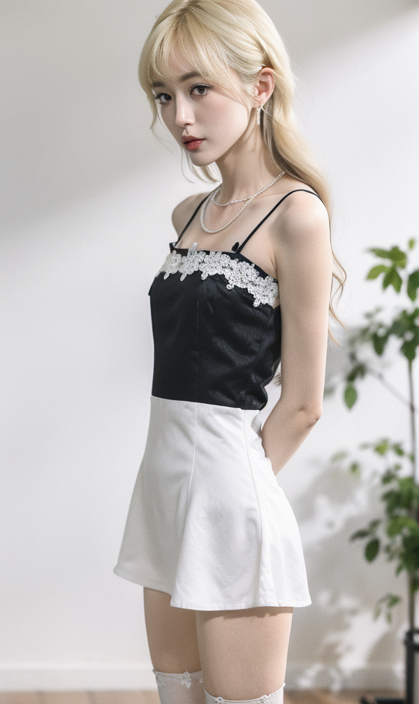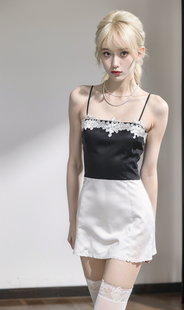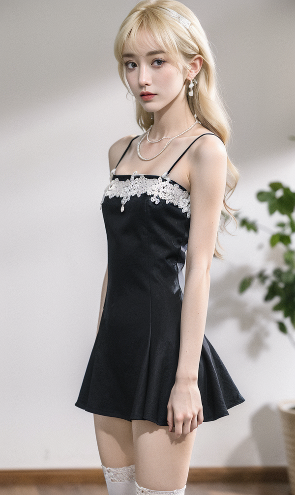 プロンプトワード: black-dress, white thighhighs, necklace, thighhighs, black dress, jewelry