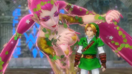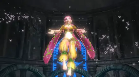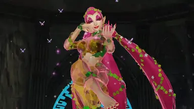 GreatFairy_HW, 1girl, solo, 巨大な女性, 尖った耳, ピンクの髪, 口の下のほくろ, 長い髪, 紫の目, 紫のアイシャドウ, 化粧, 赤い唇, ピンクの眉, 後ろに流した髪, ポニーテール, ツインテール, 髪に白い花, 髪に葉, ピンクの爪, 裸足, ピンクの足の爪, 大きな胸, 胸元, 腹部, へそ, 体格が良い