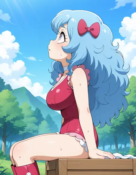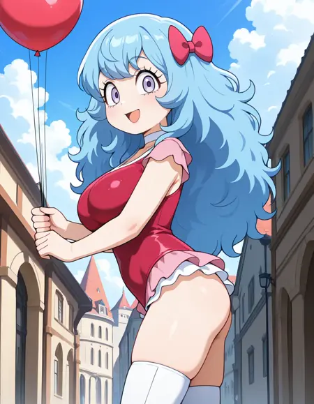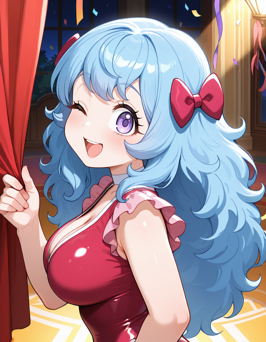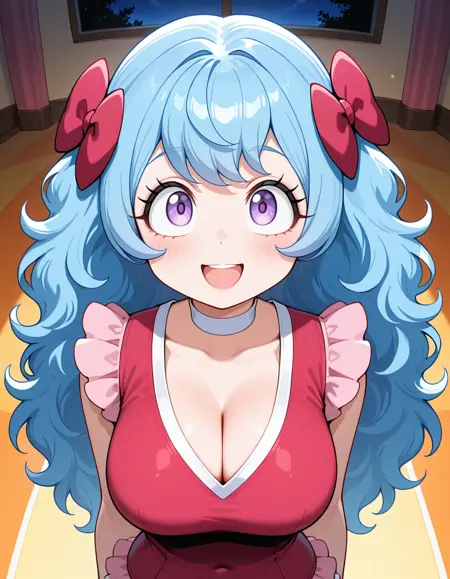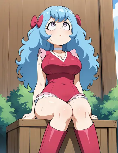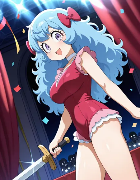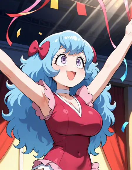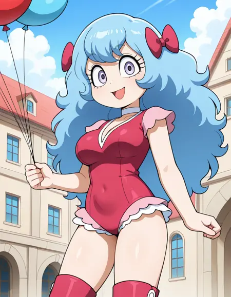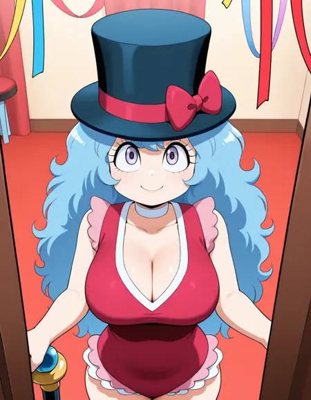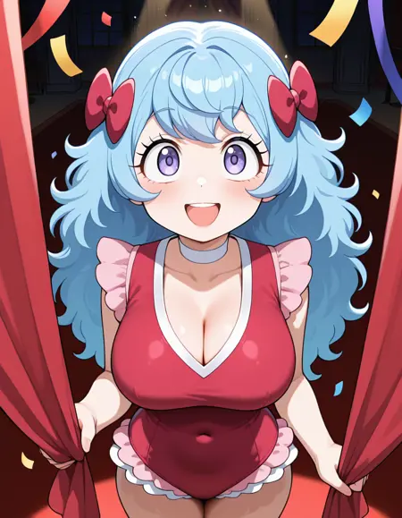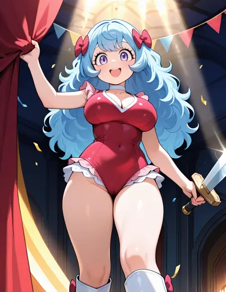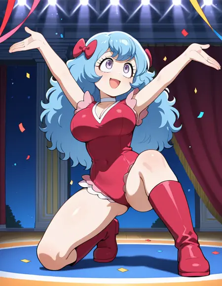 (circus-sasha), (anime screenshot, official style, tareme, eyelashes, blue hair, long hair, wavy hair, bangs, magenta bow, large breasts), (magenta leotard, pink frills, white choker, magenta knee boots)