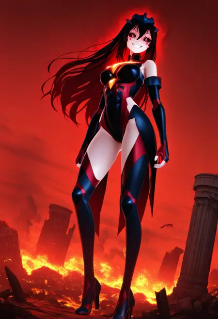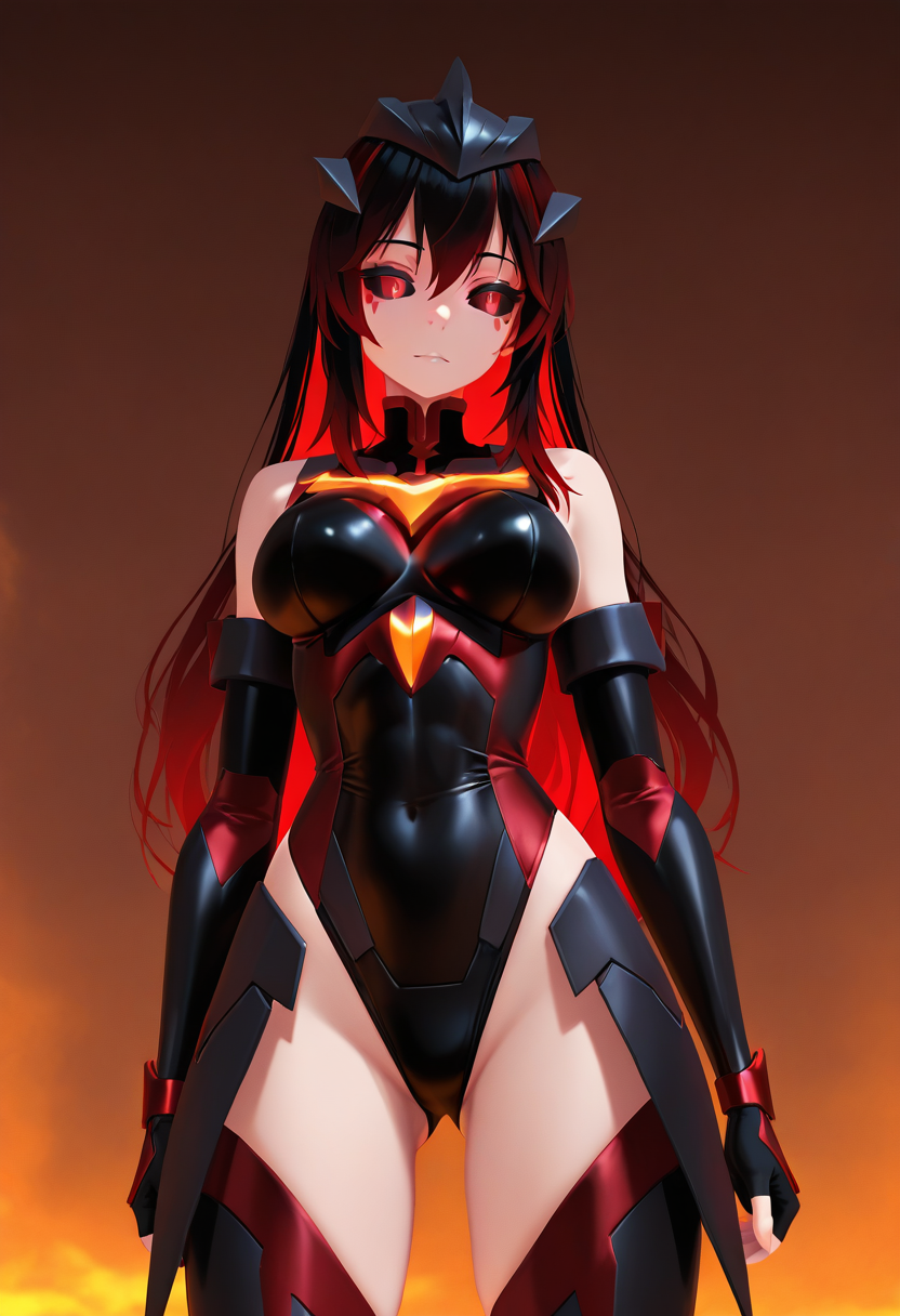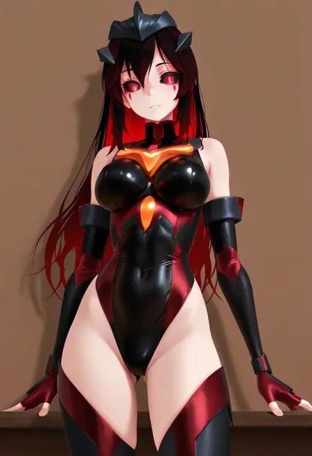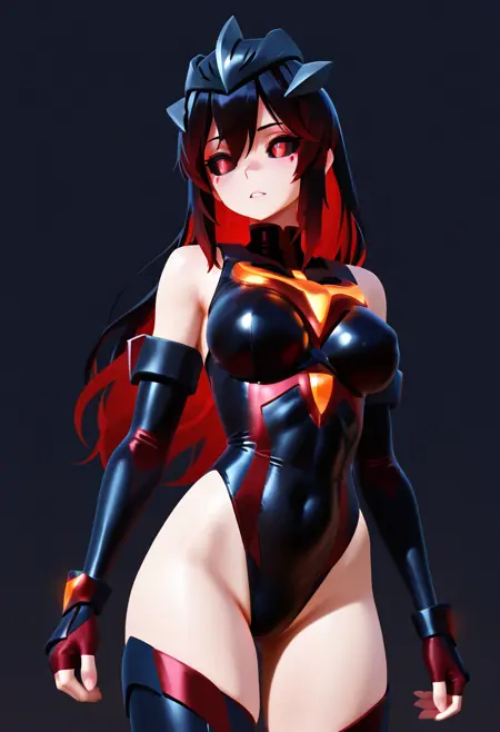 红色眼睛,裸露的肩膀,盔甲,黑色巩膜,长发,面部纹身,拟人化,中等胸部,多色头发,黑发,头饰,黑色肘部手套,露指手套,黑色紧身衣,黑色大腿长靴