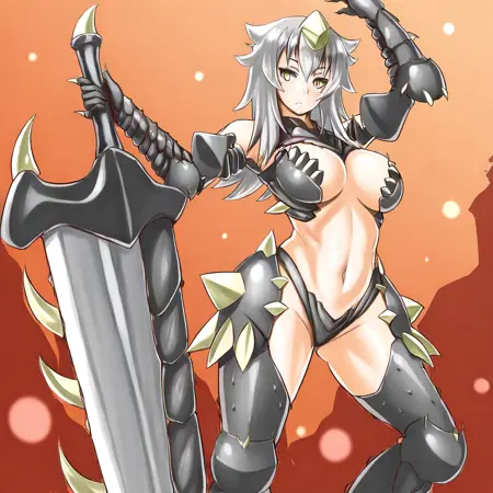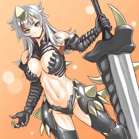 BlackKingMS、1girl、ソロ、モンスター娘、擬人化、筋肉質な女性、流れるような銀灰色の髪、長い髪、角、前髪、鋭い黄色い目、唇、フィットする黒い鎧、ドラゴンのうろこ、低めのトップ、大きな胸、へそ、お腹、突起のある肩当て、腕ガード、爪の付いた手袋、ビキニ鎧、黒いブリーフ、広いヒップ、突起で装飾されたハイカットビキニパンツ、膝ガード付きのスリーブレングブーツ、すね当て、爪の付いたつま先、巨大な大剣、黒い岩からできた長く不規則な Blade、大きな不規則な突起が付いている