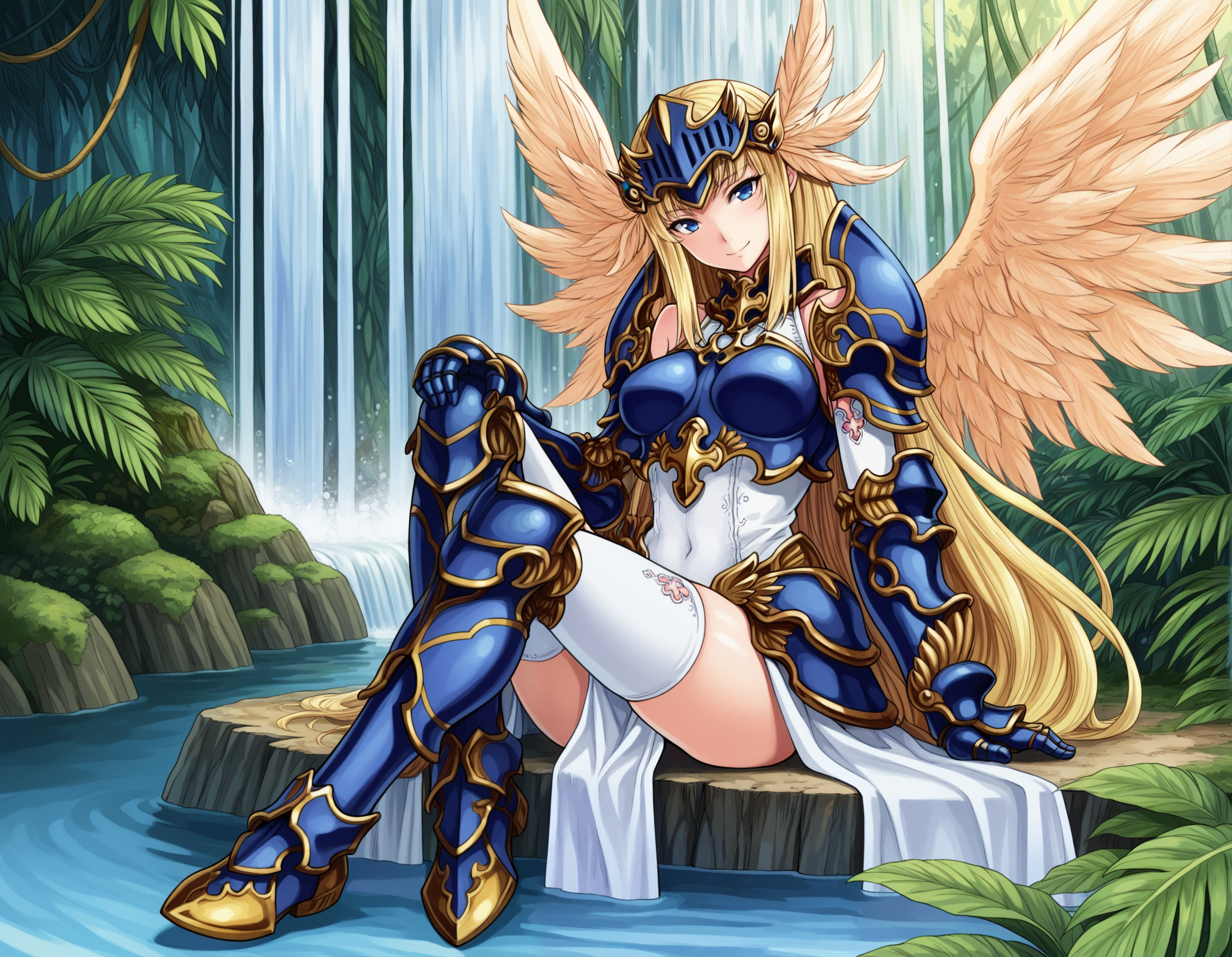 v4lkry, blonde hair, wings, winged helm, gorget, cuirass, pauldron, vambrace, gauntlets, armored dress, holy thighhighs, greaves, sabatons, holding a golden atgeirr spear, holding a blue heart-shaped shield, valkyrie armor, jupon