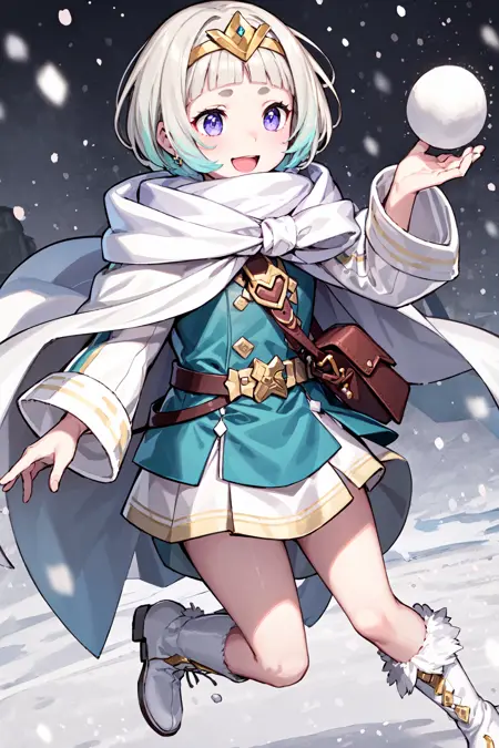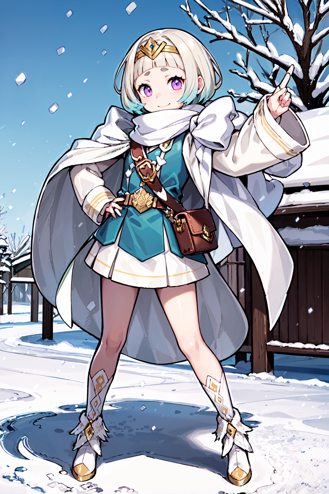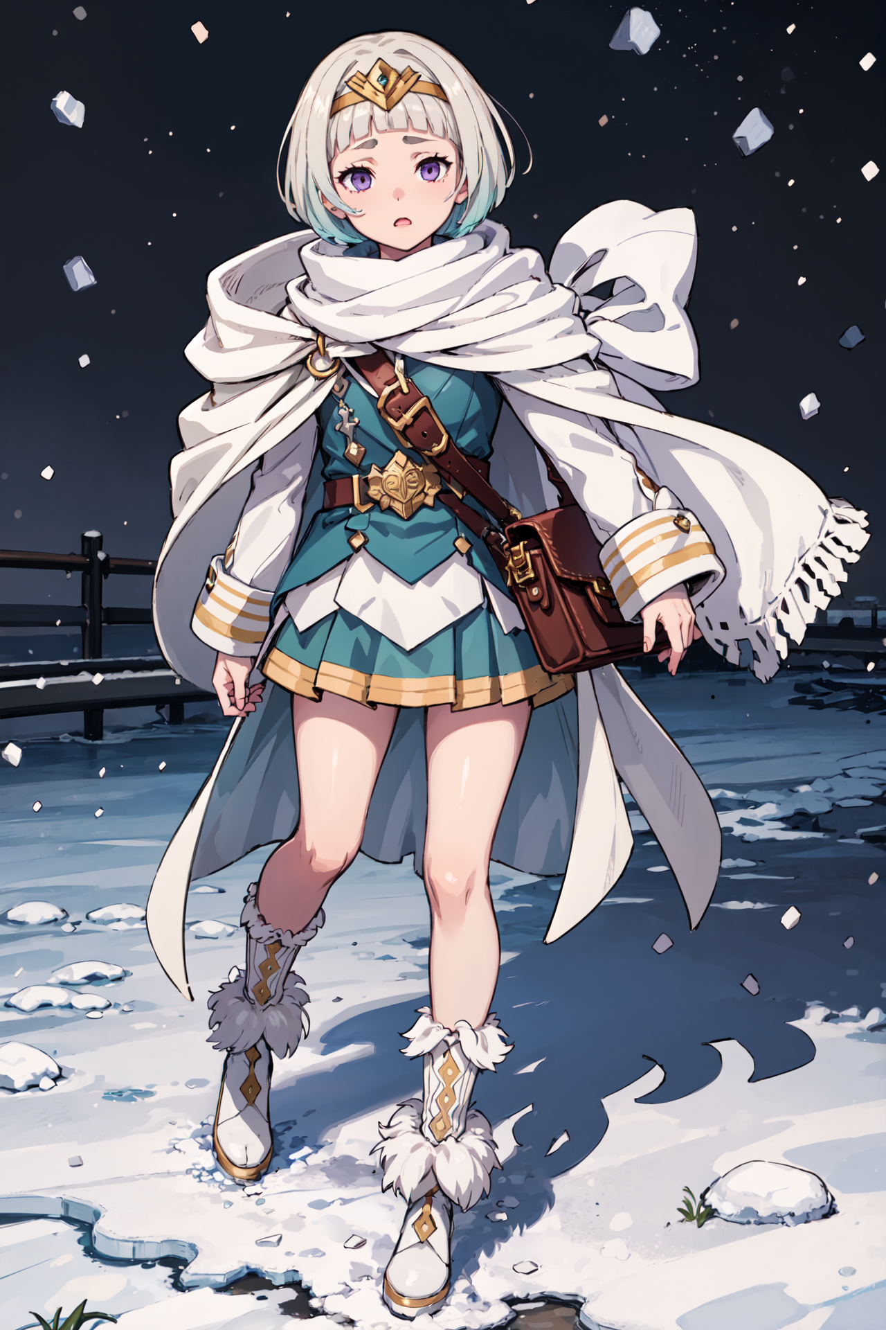 【default outfit Prompt】: def_ylgr, dress, short dress, long sleeves, jewelry, boots, belt, white cape, white footwear, fur trim,