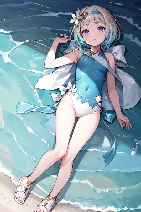 【Summer outfit Prompt】: sum_ylgr, white swimsuit, one-piece swimsuit, hair flower, blue hairband, sandals, cape, bare shoulders, collarbone, white footwear, bare legs, bare arms, toeless footwear, jewelry, covered navel