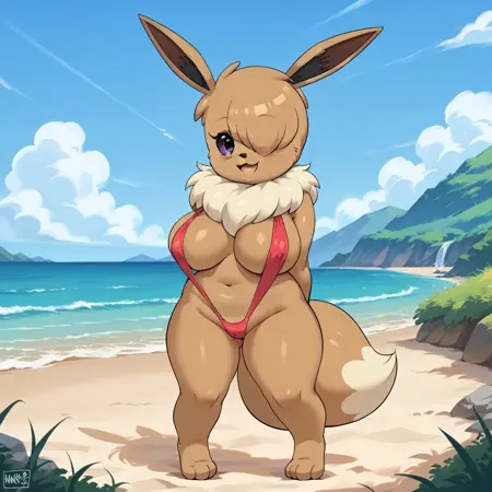 pokemon (creature), eevee, brown fur, two-tone fur, brown eyes, short hair, hair covering eye, black nose, large ears, fluffy neck fur, fluffy tail, large breasts, shortstack,