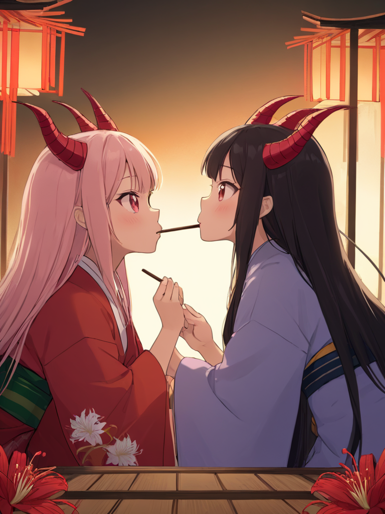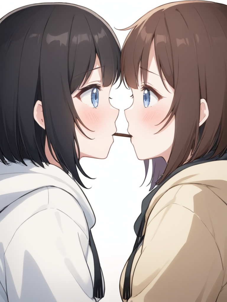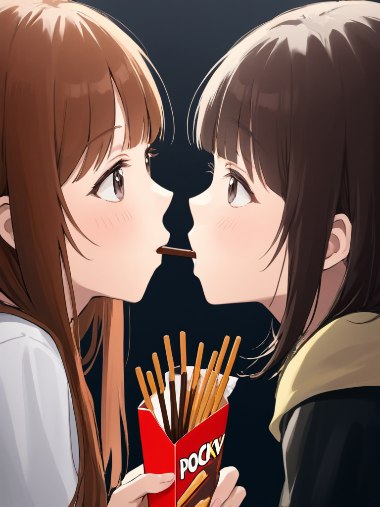 😙2人の女の子、ポッキーゲームを楽しむ、ポッキー、ポッキーデー、口に食べ物、食べ物を共有する、