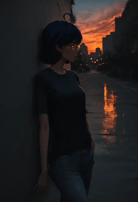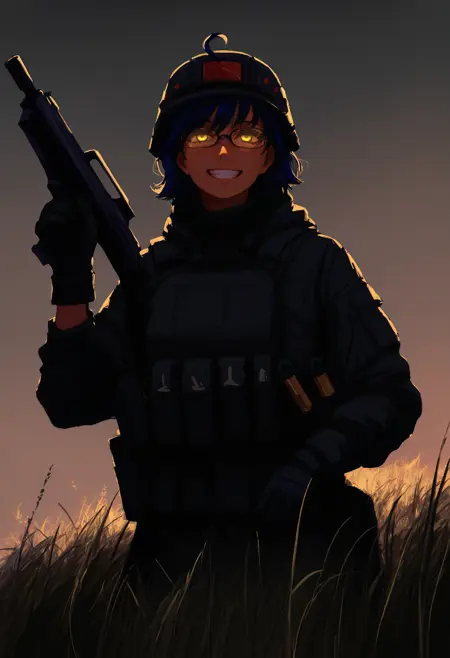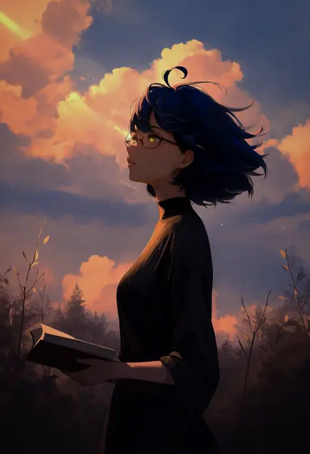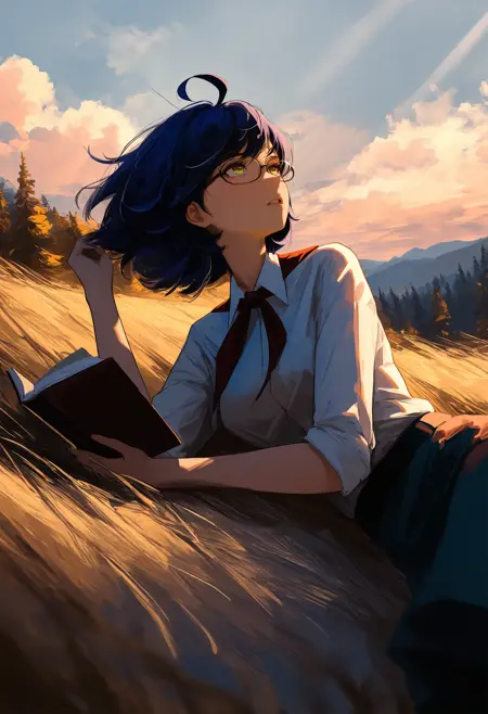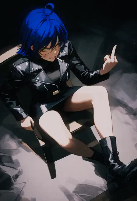 Tags - jenek, short hair, glasses, blue hair ,short sleeves, yellow eyes, 1girl, solo, ahoge, white shirt, blue skirt, red neckerchief