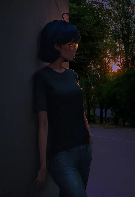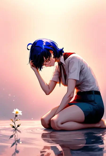 标签 - jenek, 短发, 眼镜, 蓝发, 短袖, 黄眼, 1个女孩, 单人, 头发翘起, 白衬衫, 蓝裙子, 红领巾