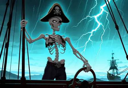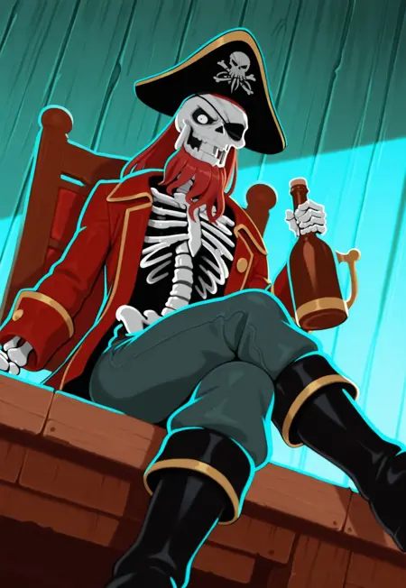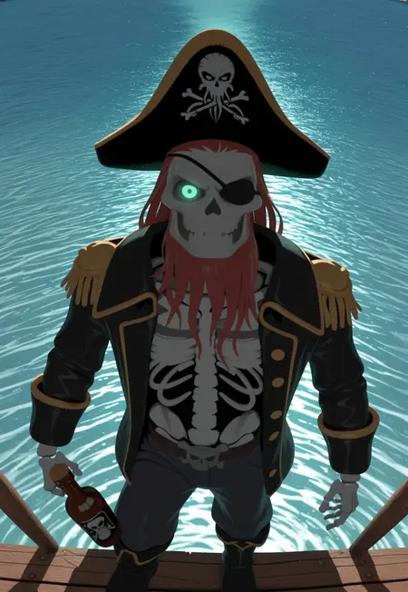 バンド《Alestorm》のクリップに登場するアニメ風の海賊の骨格。