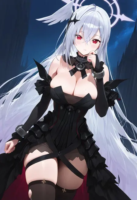 emden cosplay,golden hair ornament,single covered eye,white rose,flower over eye, scrunchie,wrist scrunchie,cleavage,collar,choker,cross,covered navel,ribbon,golden trim,sheer leotard,armor,white skirt,white thighhighs