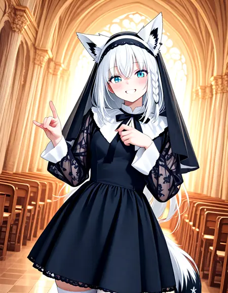 (黒いシスター服。腰まで流れる白髪。ぴくりと揺れる狐耳。彼女の背後には、まるで天使の翼が広がったかのように光が差していた)