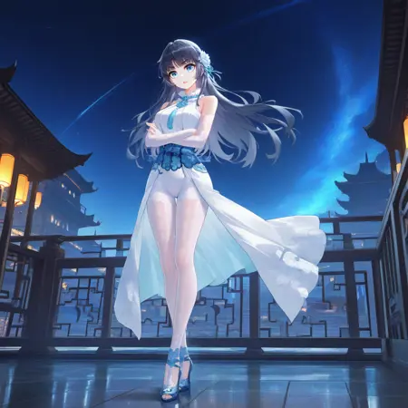 LingQingzhu_IL, Lqg_1st, 蓝眼睛,黑发,长发,白色连体紧身衣,无袖,白色紧身衣,无袖紧身衣,透明腿部服饰,敞开式外套,白色丝袜,透明,条纹丝袜,花卉图案,蓝色束腰,束腰,无袖外套,白色外套,荷叶边领子,露肩,透明披肩,白色披肩,吊坠,珠宝,发饰花,透明花朵,可拆卸袖子,蕾丝袖子,白色袖子,新娘手套,露趾鞋,蓝色鞋子,高跟鞋,细带高跟鞋,蓝色脚链,