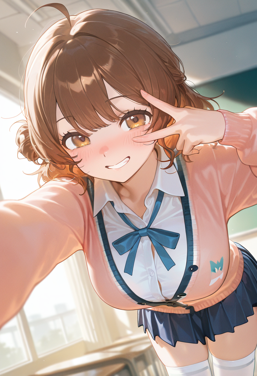 그녀의 옷 N°1 태그: shirt, thighhighs, long sleeves, school uniform, white shirt, pleated skirt, collared shirt, miniskirt, white thighhighs, blue skirt, pink cardigan,