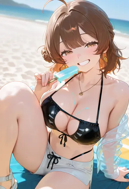 그녀의 외모 태그: 1girl, solo, blush, short hair, large breasts, brown hair, brown eyes, ahoge, hair bun,