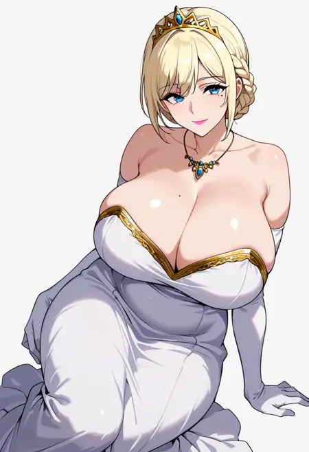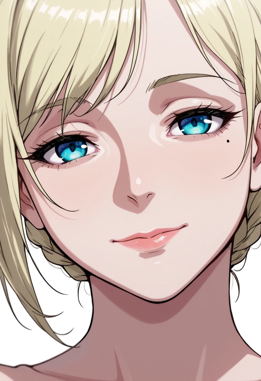 cattleya_peralim, blue eyes, blonde hair, short hair, braid, necklace, mole under eye, lips,