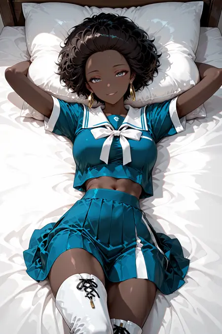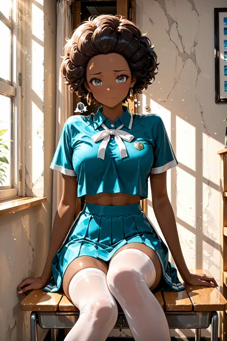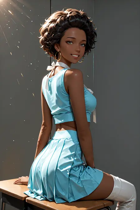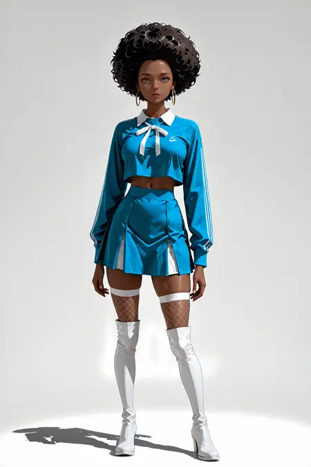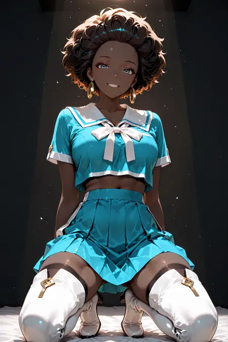 You'll probably also want to prompt "(very dark skin:1.2), blue shirt, blue skirt, afro, thigh boots, ," if you want to get the outfit and skin more consistent.
