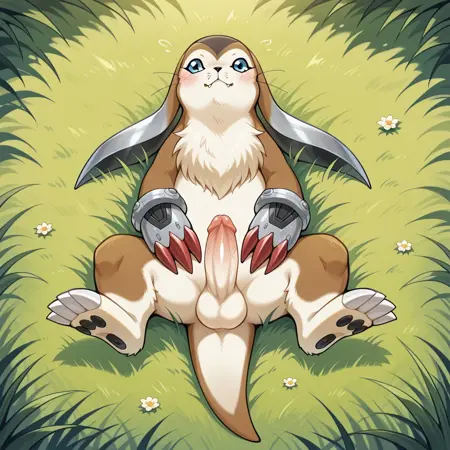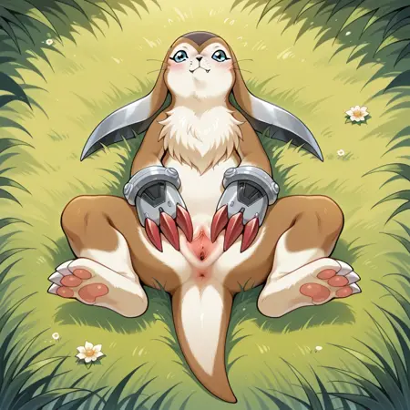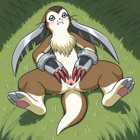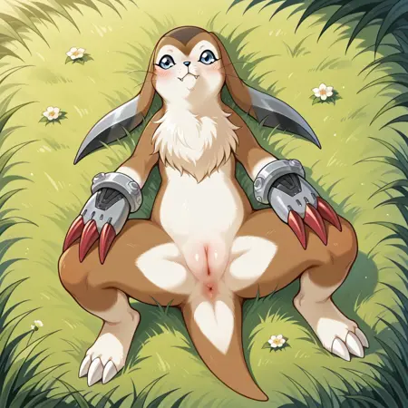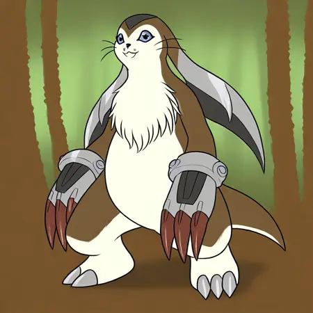 digimon (creature), rodent, prairie dog, brown and tan fur, black pupils, blue sclera, black nose, whiskers, long metal ears, fluffy chest fur, mechanical hands, red claws, thick tail,