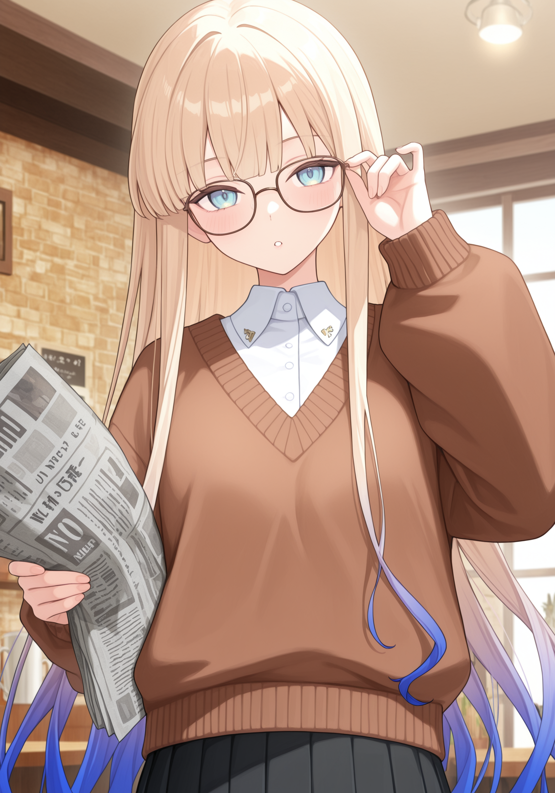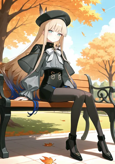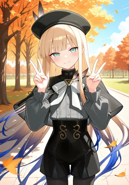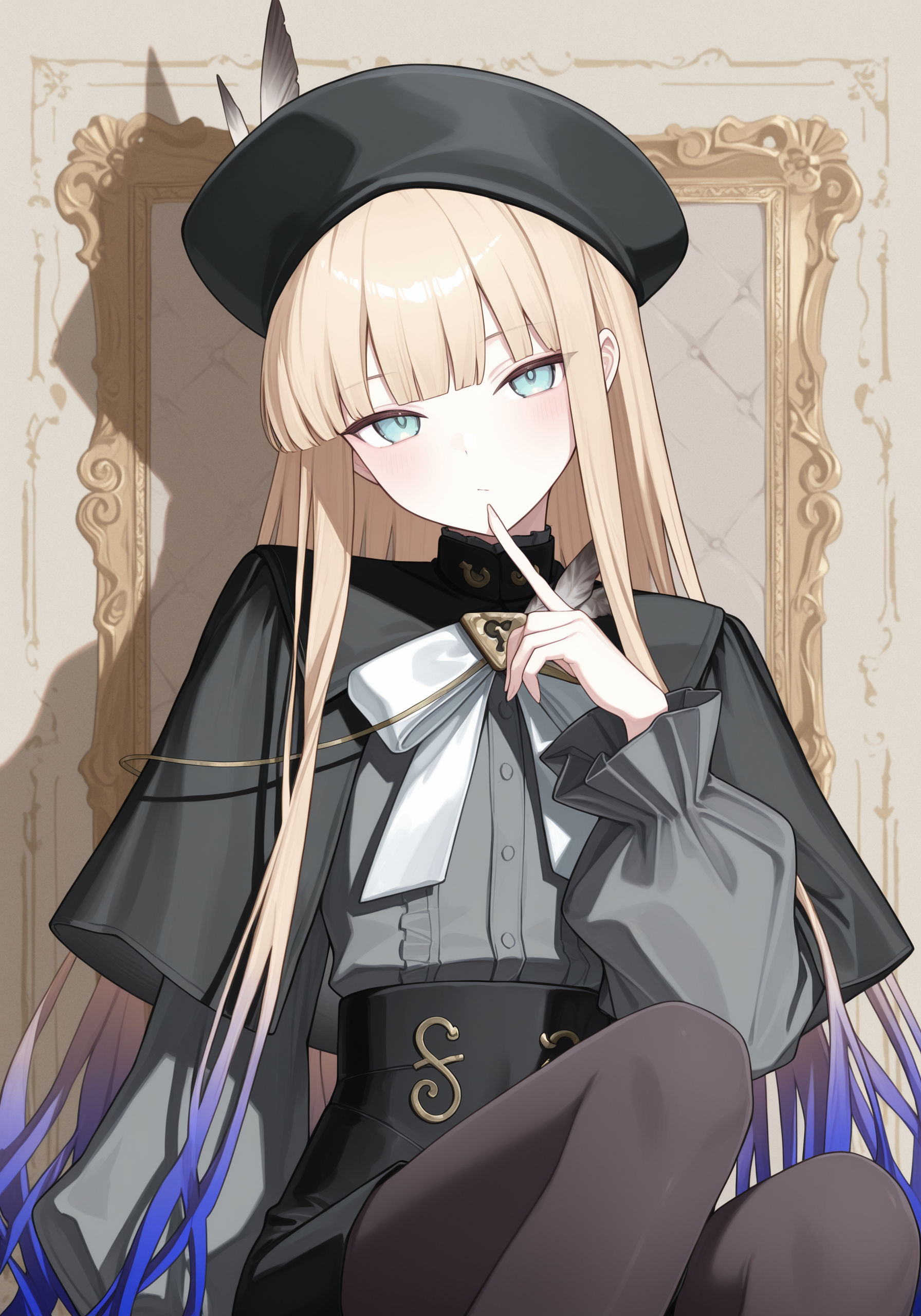 昇進2:nmo、金髪、グラデーション髪、黒いベレー帽、帽子の羽飾り、黒いカーディガン、ボウタイ、グレーのシャツ、ハイウエストショートパンツ、パンティー、黒いハイヒール、かかとストラップ