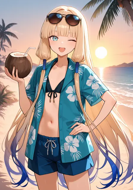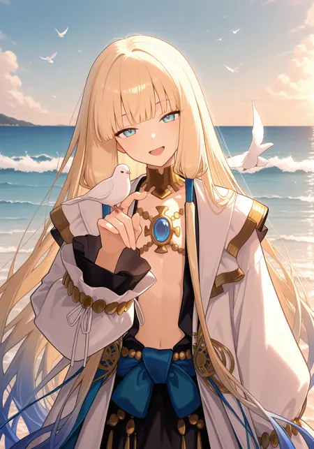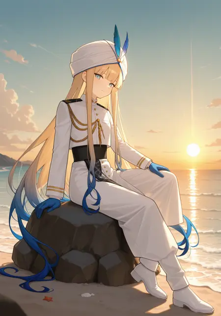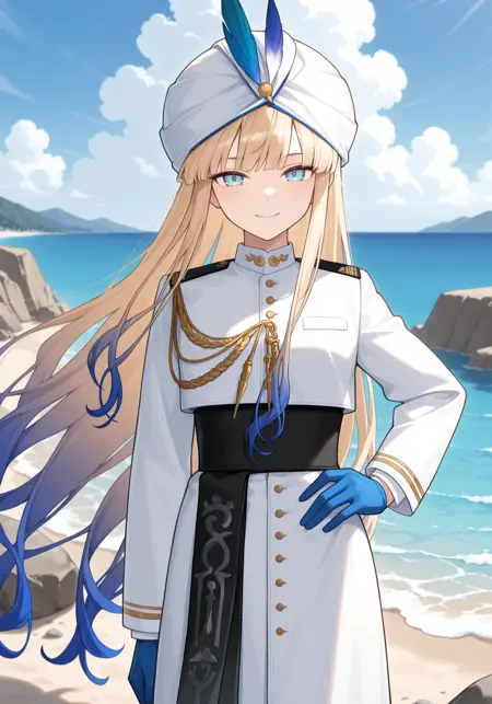 昇進1:nmo、金髪、グラデーション髪、白いターバン、髪の羽飾り、黒い帯、腰布、海軍制服、青い手袋、白い靴