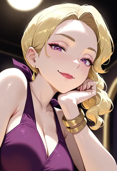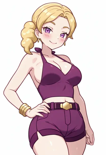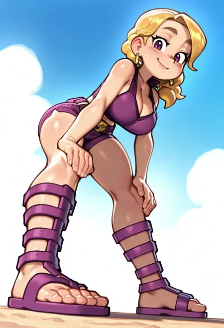 키워드는 beautyoras이며, 기본 옷차림으로는: 금발 머리, 보라색 크롭탑, 보라색 반바지, 짧은 반바지, 벨트, 글래디에이터 샌들, 금팔찌, 가슴선을 사용하세요.