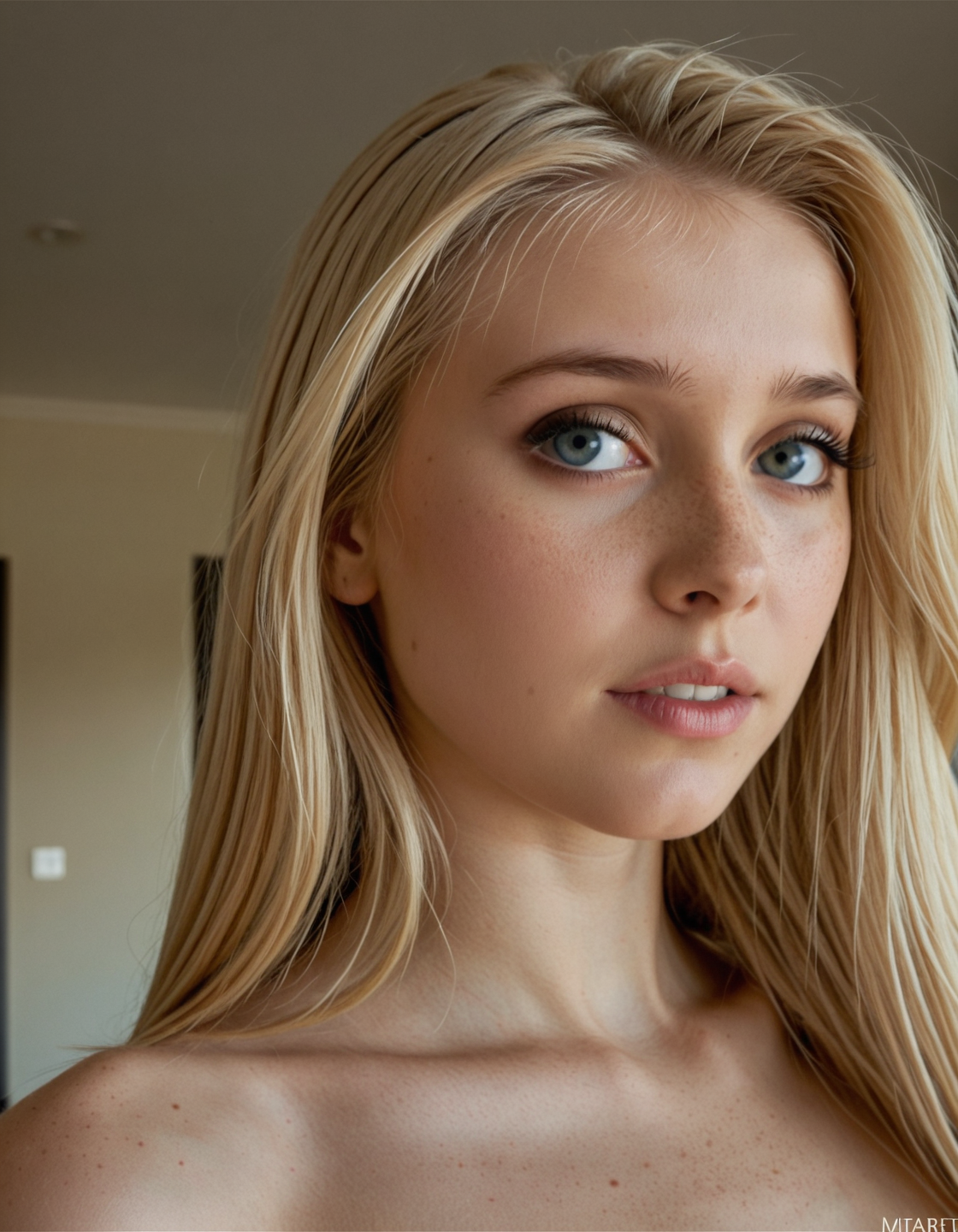 추가 태그: 1girl, blonde, adjusting hair, freckles