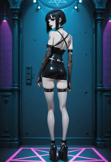 dystopiagoth, gothic, pale skin, inverted bob cut, black eyes, makeup, black lips, choker, small breasts, fingerless elbow gloves, tattoo, black corset, black miniskirt, fishnet thighhighs, black platform footwear, platform heels, fishnets, torn clothes, pentagram, spikes,