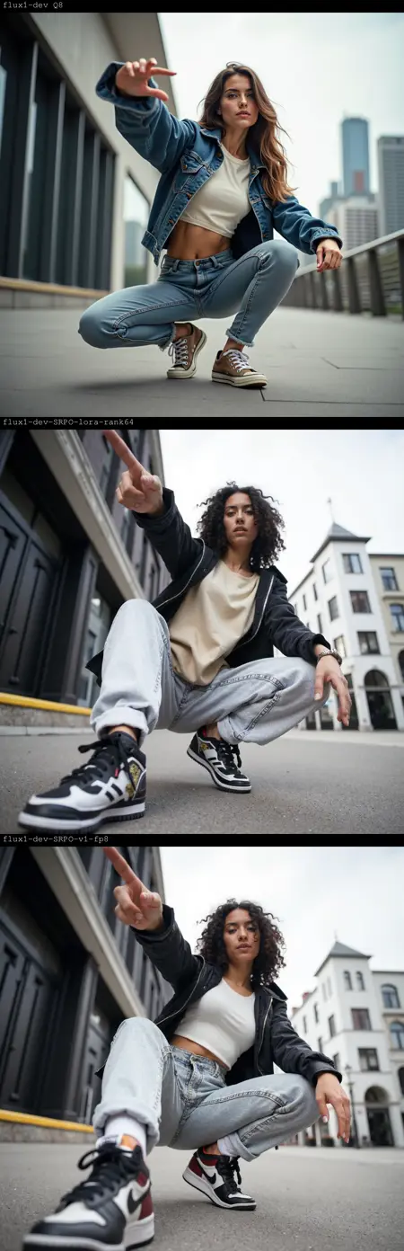 - 社区检查点:rockerBOO/flux.1-dev-SRPO(目前这些 LoRA 尚未在此处的 CivitAI 发布,但可在 Hugging Face 上找到)