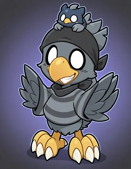 狱友奇哥鸟,灰色羽毛,黄色喙,黄色腿部,短圆翅膀,白色眼睛上戴黑色头巾,头顶有灰色绒毛,邪恶笑容,条纹毛衣