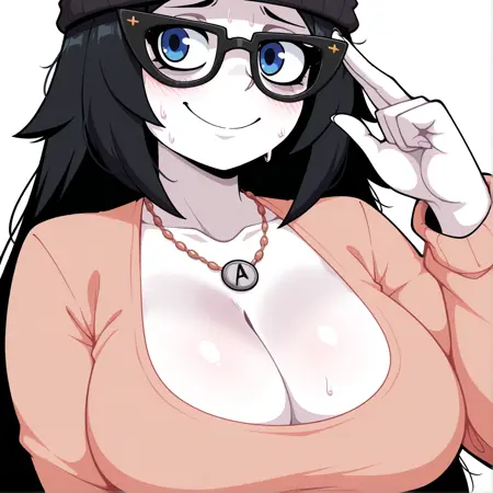 Appearence: black hair, necklace, long hair, head bend, glasses, pale skin, blue eyes,long sleeves, white skirt, long skirt