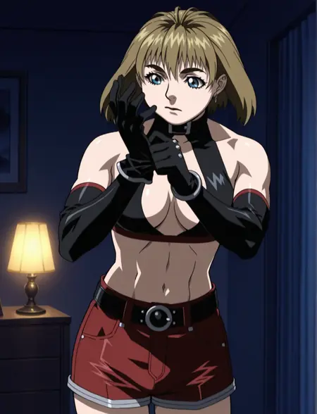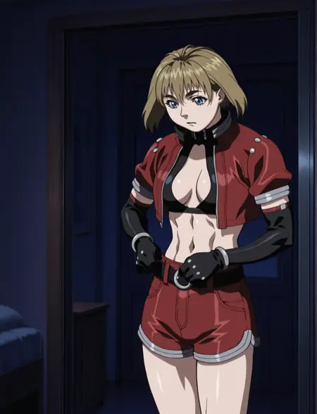 外套/红色夹克/短款夹克/红色短裤/灰色靴子/手套/肘部手套/太阳镜