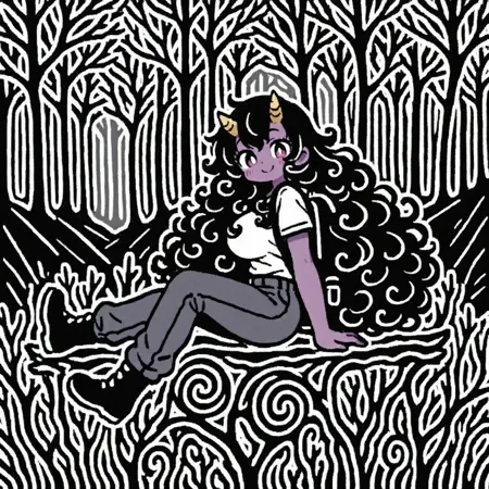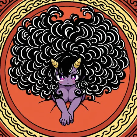 这个LoRA生成一位紫色鬼女,拥有蓬乱卷曲的头发。