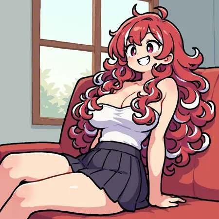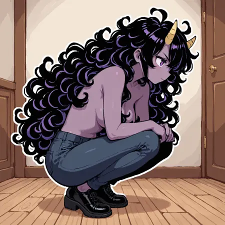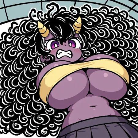 This LoRA generates a purple oni woman with wild curly hair.