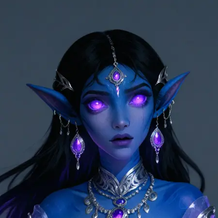 Nigelfmb2, 파란 피부, 검은 머리카락, 긴 머리카락, 보라색 눈, 뾰족한 귀, 보석, 귀걸이,
