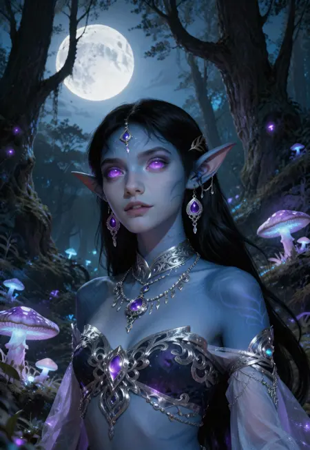 Nigelfmb2, blue skin, black hair, long hair, purple eyes, pointy ears, jewelry, earrings,