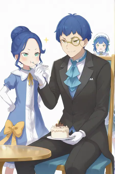 Clind-Liver020, 1boy, solo, blue hair, short hair, yellow eyes, monocle, gloves, white gloves, black suit, long coat, tailcoat, blue ascot, formal, formal attire, cravat, blue cravat, vest, blue vest, dress shirt, white shirt, button-up shirt, fancy clothes, black pants, black trousers,