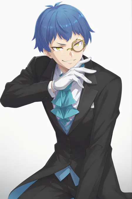 Clind-Liver020, 1boy, solo, blue hair, short hair, yellow eyes, monocle,