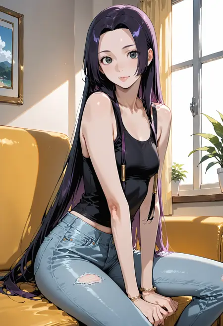 외모: 1소녀, 검은 눈, 녹색 눈, 검은 머리, 긴 머리, 매우 긴 머리, 앞머리, 보라색 머리