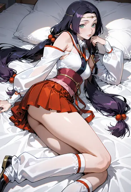 대안 복장 1: 두 줄기 머리, 낮게 묶인 긴 머리, 머리 장식, 머리 장신구, 환관, 분리된 소매, 치마, 미니스커트, 주름 치마, 빨간 치마, 다리 보온대, 양말, 느슨한 양말
