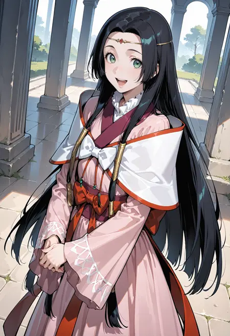 복장: 보석, 목걸이, 리본, 빨간 리본, 리본, 환관, 일본 복장, 긴 소매, 넓은 소매, 띠, 드레스, 샌들, 플랫폼 신발