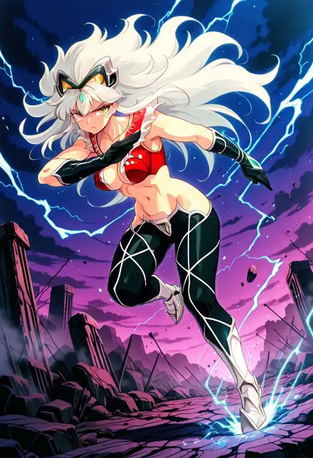 AlienGodolaMS, 1girl, solo, monster girl, personification, silver hair, long hair, hair ornament, bangs, amber eyes, lips, red crop top, large breasts, navel, midriff, groin, wide hips, black gloves, black leggings with white diamond patterns, clawed boots with sharp spikes,