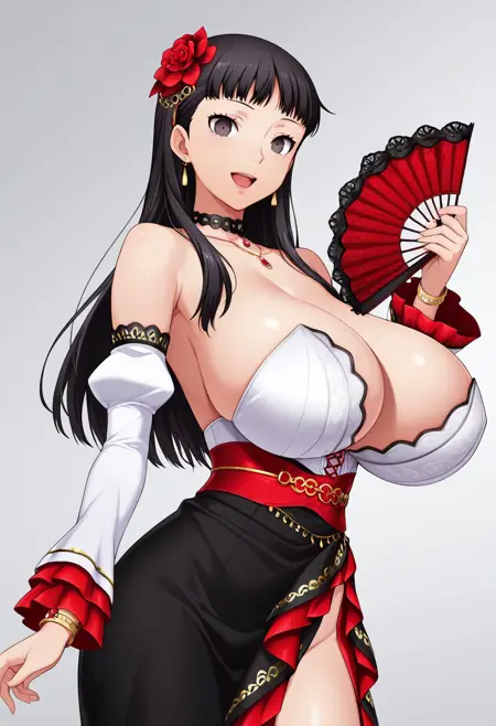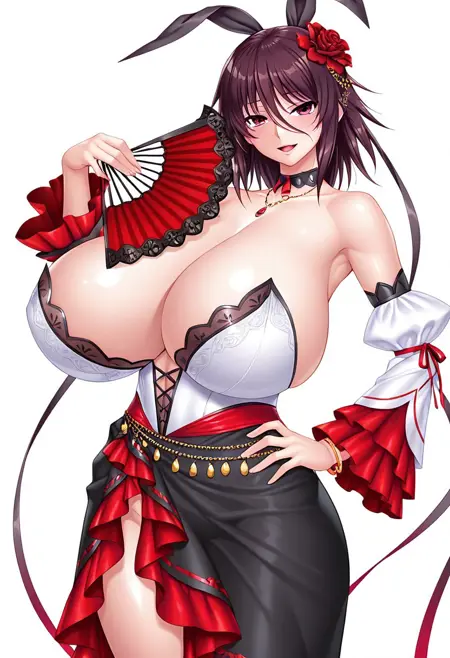 dress,black folding fan,choker,hair ornament,side slit,jewelry,bare shoulders,cleavage,white detached sleeves,sideboob,white Bustier,