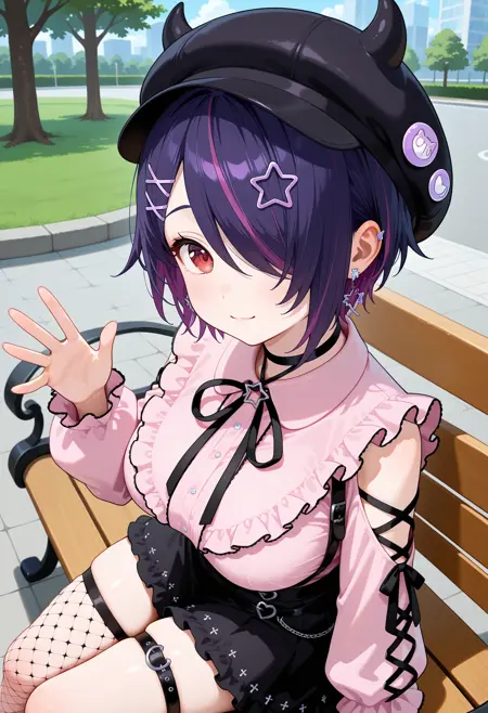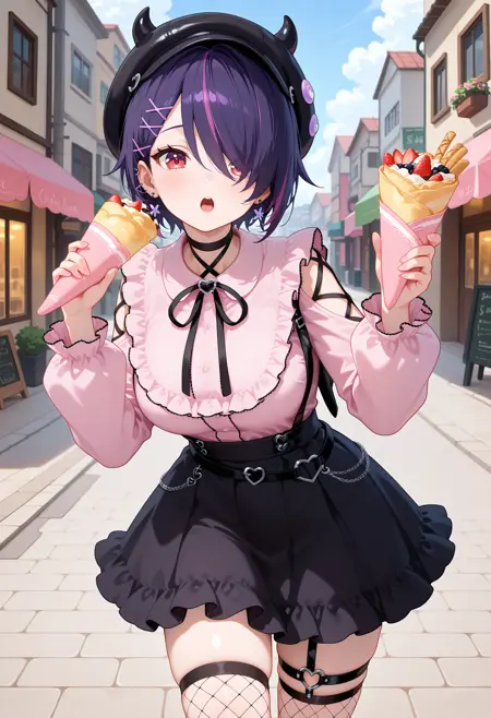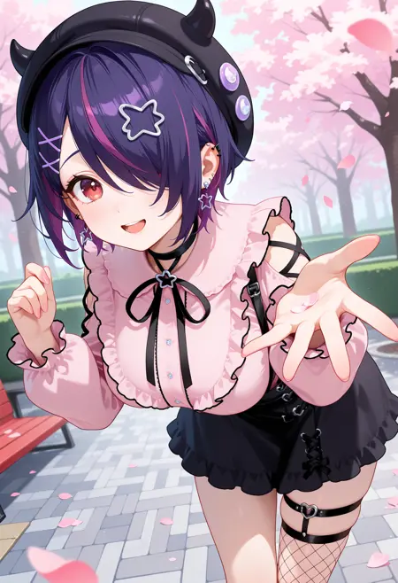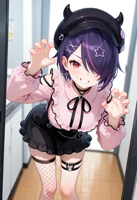outfit3 (완벽하지 않음)aatamako, short hair, streaked hair, purple hair, hat, black headwear, fake horns, hairclip, x hair ornament, hair over eye, earrings, black choker, jirai kei, neck ribbon, frills, pink shirt, long sleeves, black skirt, thigh strap, single thighhigh, fishnet thighhighs
