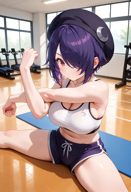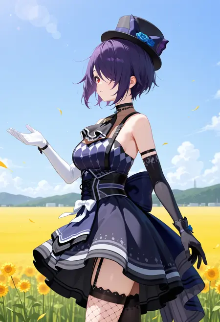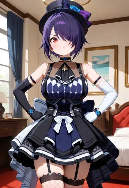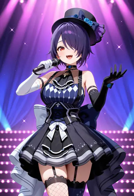 outfit2aatamako, short hair, purple hair, top hat, black headwear, hair over one eye, idol clothes, black choker, black ascot, see-through, dress, sleeveless, elbow gloves, asymmetrical gloves, white gloves, black gloves, garter straps, asymmetrical legwear, fishnet thighhighs
